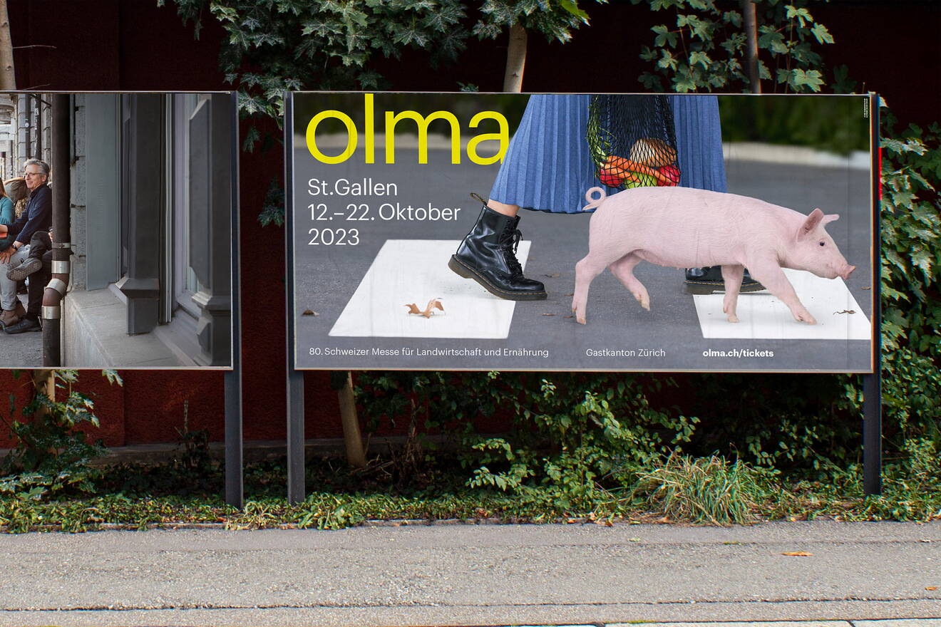 In Kooperation mit dem Studio Silvio Seiler entwickelte FORB eine Konzept-Idee, die sich im Designwettbewerb für das OLMA-Plakat durchgesetzt hat: Ein urbanes OLMA-Defilee, wo die Städterin und das Säuli gemeinsam zur Messe schreiten, prägt das Erscheinungsbild der Messe im 2023. Der zeitgemäss inszenierte «OLMA-Umzug», der Mensch und Tier, Stadt und Land vereint, wird in seiner Dynamik zum selbstverständlichen call to action.